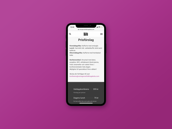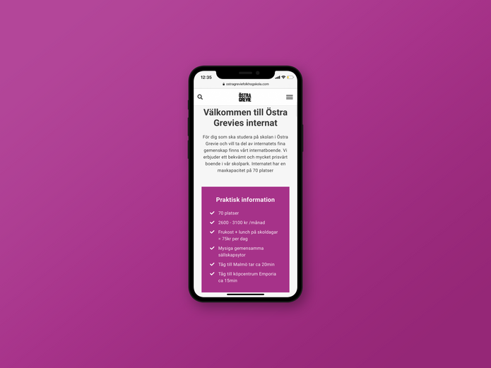 Östra Grevie folkhögskolas nya hemsida formgav Studio Isberg tillsammans med Tilda Karlsson. Fokus var lättillgänglighet och struktur. Bilder skulle vara i fokus på så sätt kan hemsidan lätt byta utseende och innehåll utan att kännas omodern på sikt. Linn från Studio Back hjälpte oss med Wordpressbyggandet.